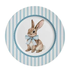 Este Prato de Sobremesa decorativo traz um design encantador com a estampa de um coelhinho delicado, usando um laço azul, perfeito para quem deseja uma mesa posta cheia de charme e temática, especialmente para ocasiões como a Páscoa ou festas infantis.