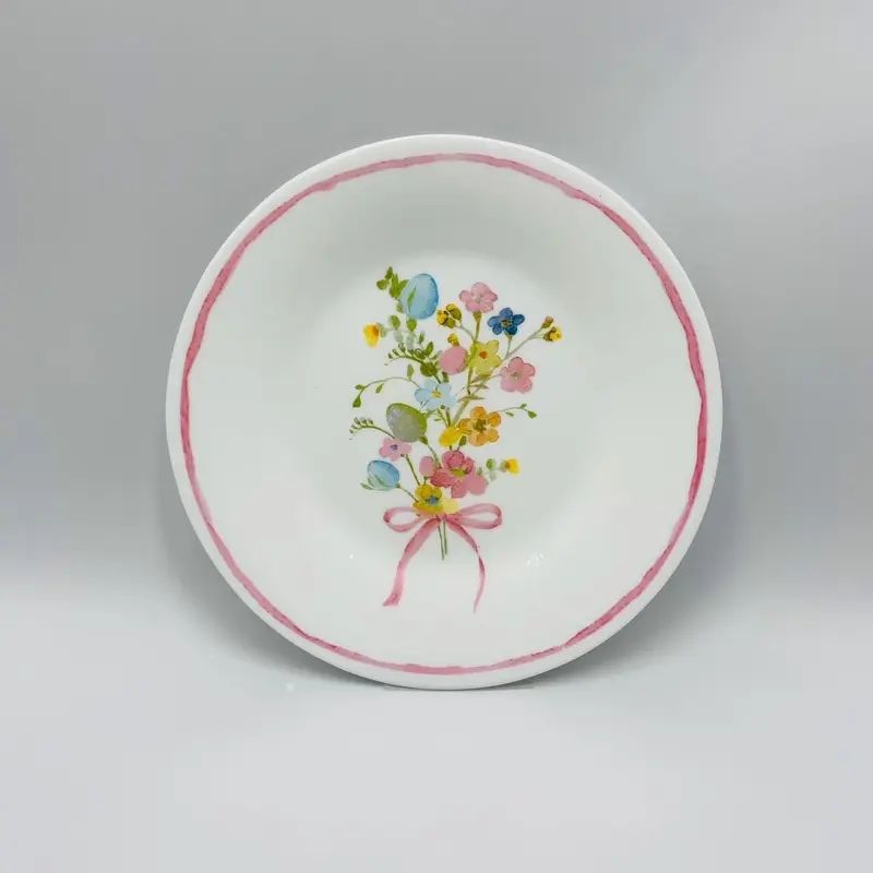Delicado e encantador, o Prato Decorado Floral de Páscoa traz uma estampa suave de bouquet de flores com ovos coloridos e laço, criando uma composição romântica e acolhedora para a mesa posta. O detalhe da borda em tom rosado valoriza ainda mais a peça, trazendo leveza e elegância.